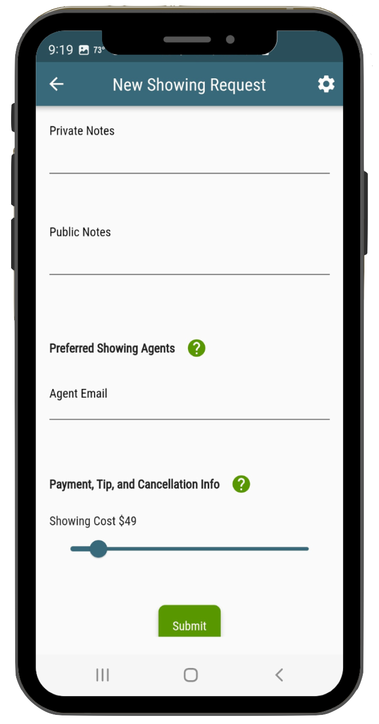 Our app makes it easy to request home showings. Simply create a new showing request, enter in the information required, set a price, then submit the showing.